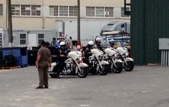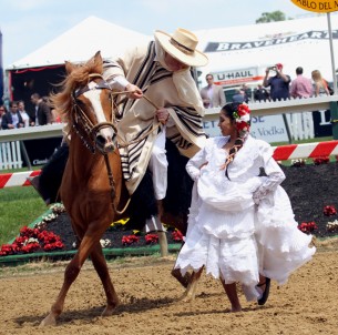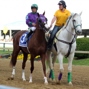 California Chrome with Victor Espinoza up and Gray Horse, with Jessica Lindsey. Photo by Laurie Asseo.