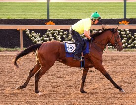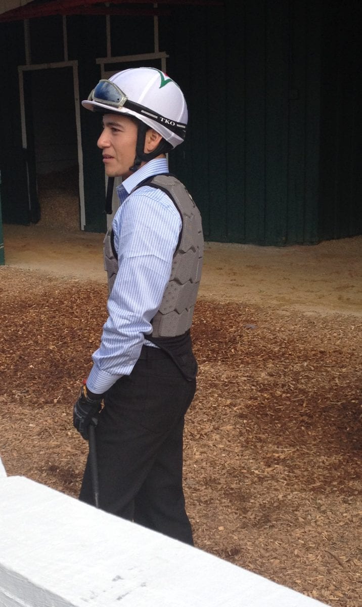 Luis Contreras, all dressed up to breeze Social Inclusion. Photo by The Racing Biz.