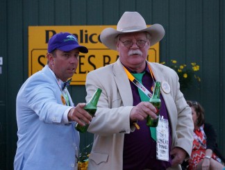 Steve Coburn (right), co-owner of California Chrome, celebrates at the post-Preakness party. Photo by Vas.