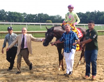 Rider Eriluis Vaz and trainer Edward Graham (in tie) celebrate Hardest Core’s Cape Henlopen win.
