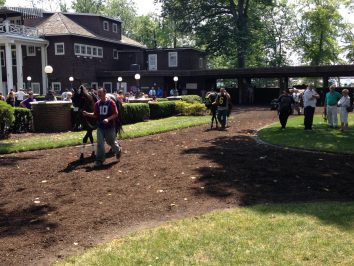 Horseless winner’s circle after Avarice is elevated to first via disqualification in the Fort Delaware. George Strawbridge (center) presents to trainer Jerry Robb (far left).