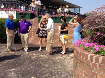 Mike Caruso (in tie) and Rudy Rodriguez (far left in ball cap) accompany Belle Gallantey after the Delaware Handicap. Photo by The Racing Biz.