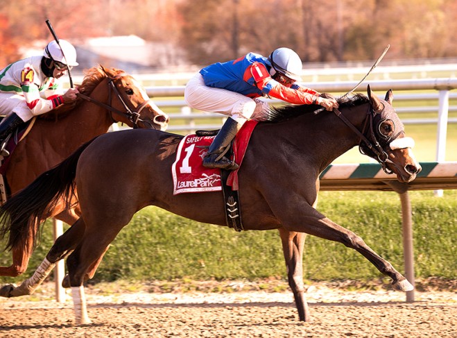 Who’s In Town rallies to take the Safely Kept Stakes at Laurel Park. Photo by Jim McCue, Maryland Jockey Club.