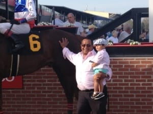 Jose Corrales and son Pachi after the Tesio. Photo by The Racing Biz. 4-18-15