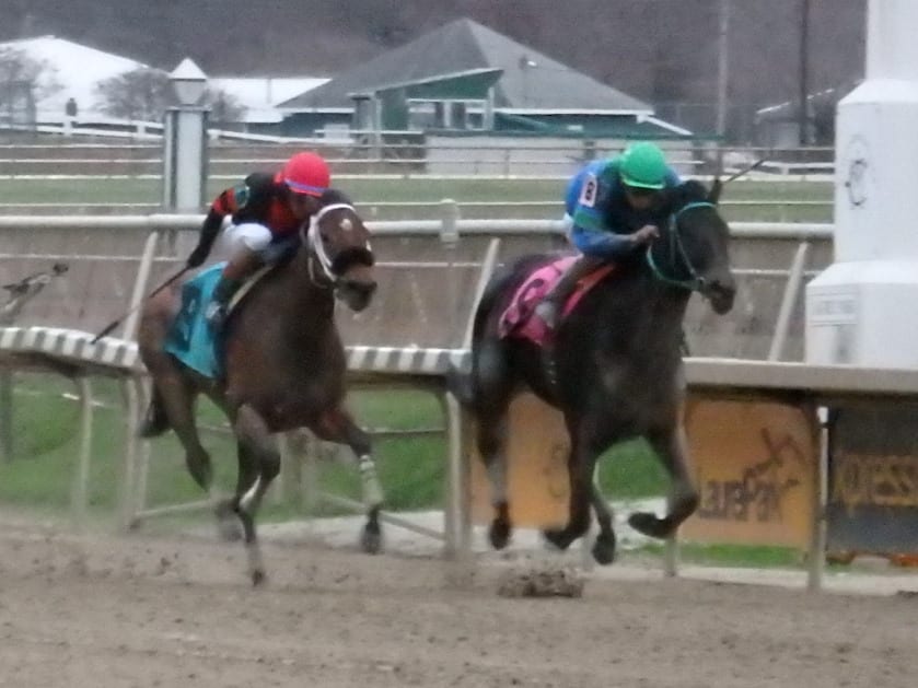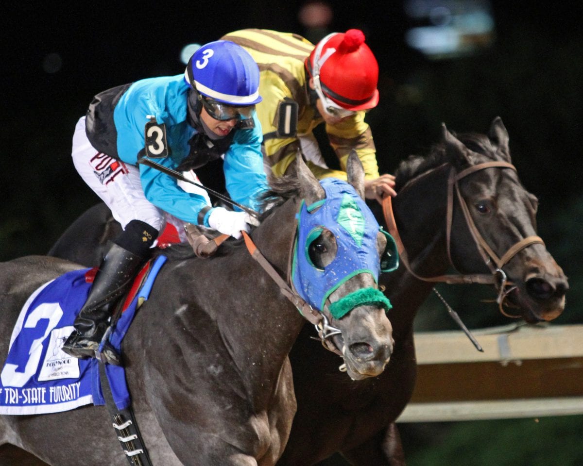 Bullets Fever edged Aye a Song to take the Tri-State Futurity Saturday at Charles Town. Photo by Coady Photography.