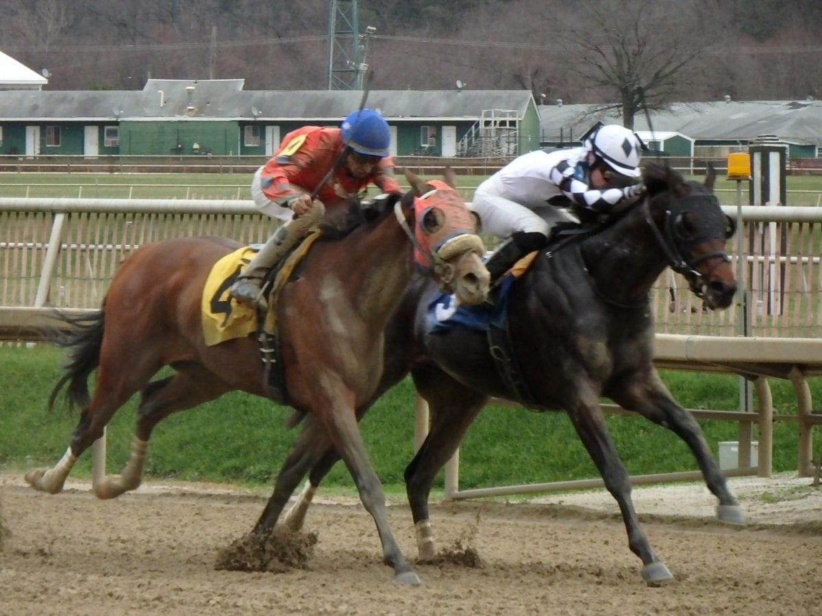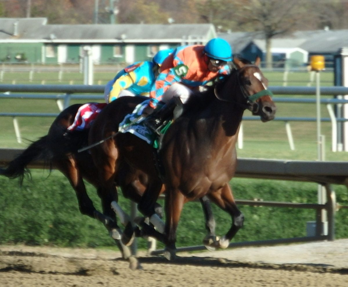 Ben’s Cat (left) and Jack’s in the Deck slugged it out in the Maryland Million Sprint, Jack’s in the Deck prevailing by a nose. Photo by The Racing Biz.