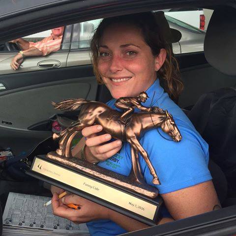 Pajeen Delp with Funny Cide Derby trophy given to her by Derby-winning connections after her horse won the opener on Derby day.