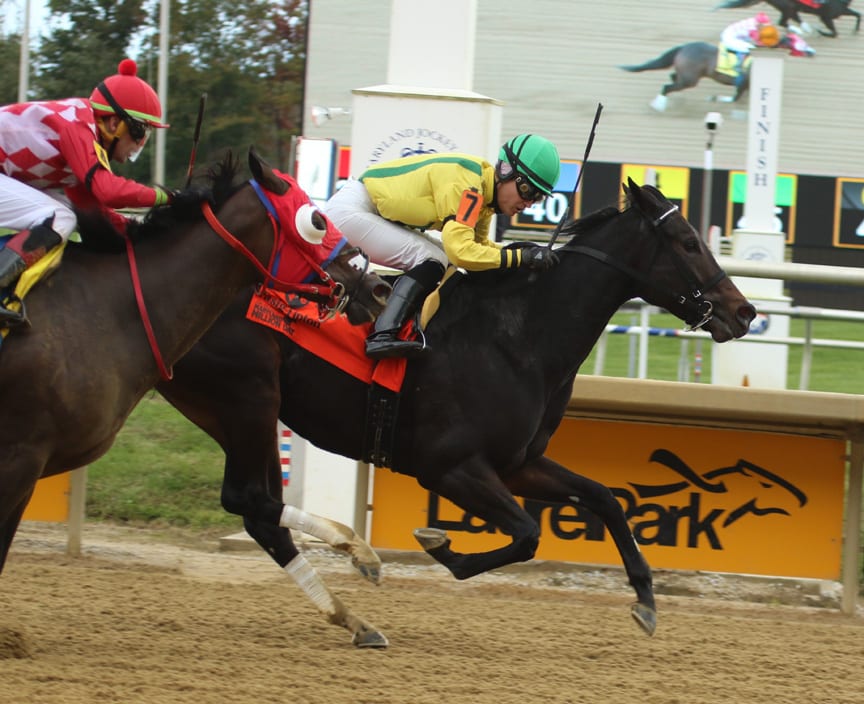 “They pushed me pretty good on early. I really had to ask her when she was challenged (by #4 – My Magician entering the stretch) but she put her head down and dug in. Going 7 (furlongs) that’s really stretching her but she’s awesome. Crabcakes and football! That’s what Maryland does, right?!“