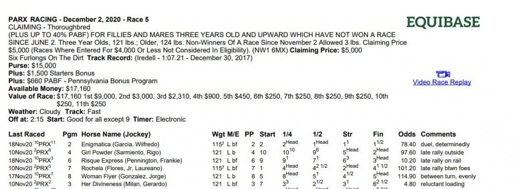 Enigmatica, who won by a half-length under apprentice jockey Wilfredo Garcia, paid $158.80 to win. The two-dollar exacta, with 97-1 Girl Powder in second, returned $3,400.20. The dime super — remarkably, someone had it — paid $21,246.18.