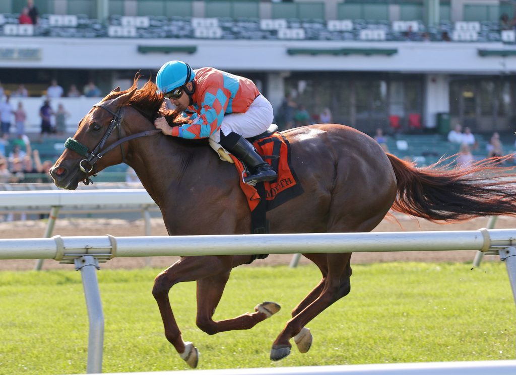 “We did the same thing as we did last race (a nose victory over Miss Auramet in an allowance at Monmouth on July 23) with the paddock routine and bringing her over with the pony and she was fine. I felt good when I put the tack on her. Everything was smooth. She has really been running big lately. I’m very pleased with her right now.”
