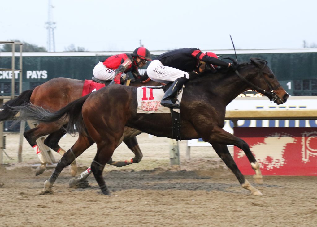 FIRST STAR: PRINCESS KOKACHIN. Sunday’s feature was an open allowance which attracted many of the region’s top filly and mare sprinters. Princess Kokachin, off an impressive allowance win in her last start, went off at 6/5, while Willa on the Move Stakes winner Kaylasaurus was the 4/5 favorite in the five-horse field. Breaking from the outside post, Princess Kokachin pressed Dontletsweetfoolya early on. Entering the stretch, she took the lead, and held off Kaylasaurus’s late rally to win by three-quarters of a length. She’s now won ten times from sixteen starts lifetime, with earnings of more than $355,000. She’s owned by Eric Rizer, trained by Jerry Robb, and ridden by Xaiver Perez.