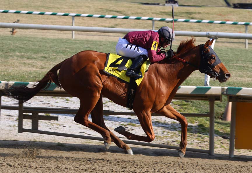 An accomplished sprinter who won at distances from 5 ½ to seven furlongs, Laki captured three straight dirt sprint division titles during the Mid-Atlantic Thoroughbred Championship (MATCH) Series in 2018, 2019 and 2021. The Series was shelved in 2020 amid the coronavirus pandemic.