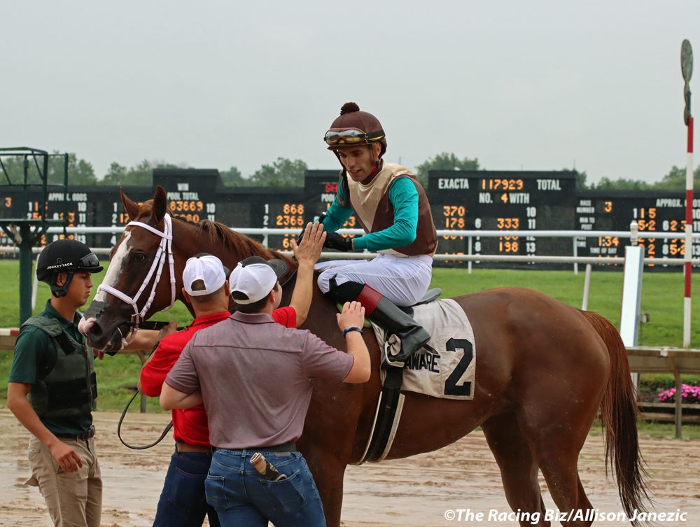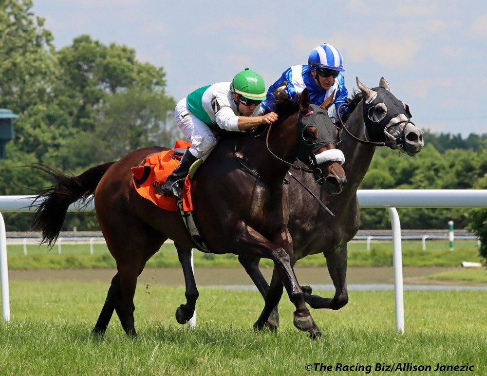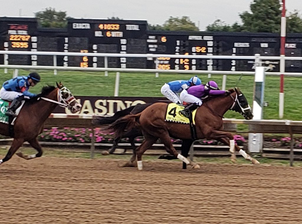 Midnight Stroll (sired by Not This Time) won the Delaware Oaks in a thriller. Trained by John Terranova and ridden by out of town jockey Eric Cancel, the filly defeated favorite Shotgun Hottie in the meet’s second most prestigious race, surviving an objection by the rider of the runner-up to win by a head.